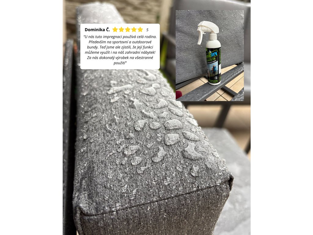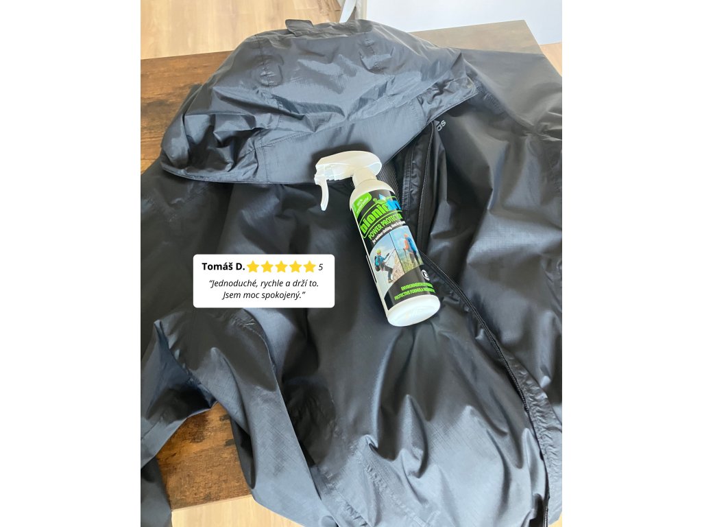 Díky praktickému rozprašovači se impregnace snadno a rovnoměrně aplikuje na všechny typy materiálů – od technických textilií po outdoorové oblečení, batohy, obuv a další vybavení.