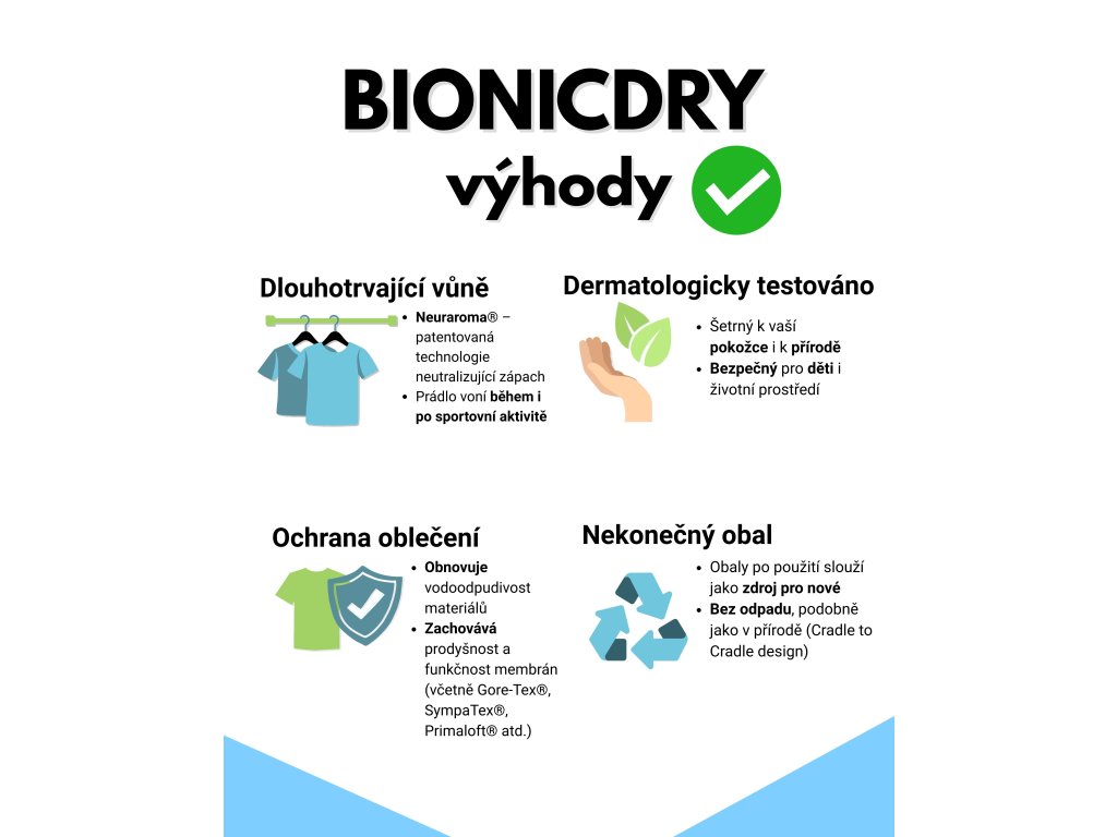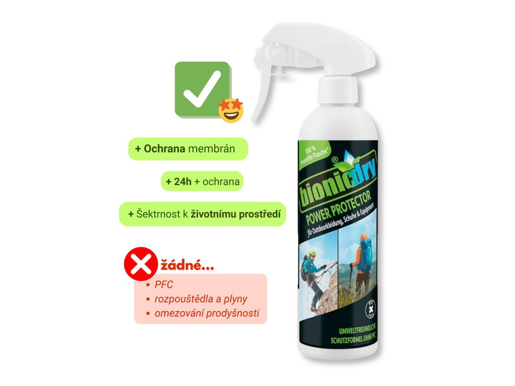 Pro dlouhodobou ochranu proti vodě je proto důležité impregnaci pravidelně obnovovat. A právě zde přichází na řadu bionicdry® Power Protector – 100% účinná impregnace pro funkční oblečení, obuv i outdoorové vybavení. Díky svému silnému a ekologickému složení obnovuje vodoodpudivost materiálů, aniž by narušila jejich prodyšnost nebo funkčnost membrán.